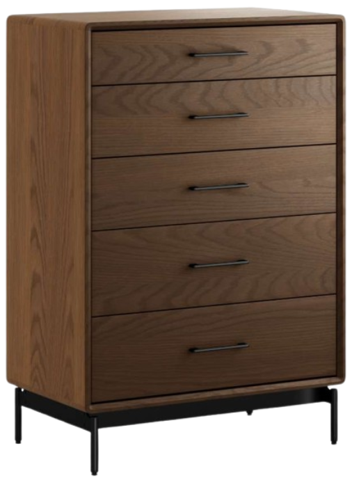 This tall storage cabinet features elegant natural wood grains, soft rounded edges, a sturdy metal base, and a proprietary interlock system with roomy self-closing drawers. This chest is a mocha finish.Read More
