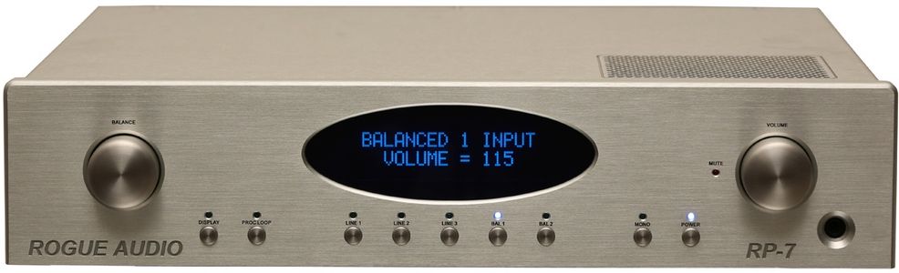 Beyond the excellent sound, the feature rich RP-7 provides all of the functions demanded of a luxury hi-end preamp. Included are a home theater bypass, processor loop, mono button, defeatable display, slow start circuitry, and a host of other features. A full function remote provides additional convenience. Two pairs of XLR balanced inputs and three pairs of RCA line level inputs allow for numerous source components while two pairs of XLR balanced outputs along with two pairs of RCA variable outputs facilitate a wide range of output connectivity. Also included is a high power tube based headphone amplifier capable of driving even the most difficult headphones.
