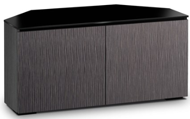 Lightly textured, alpi gray oak doors with black, tempered glass top and black oak finished end panels