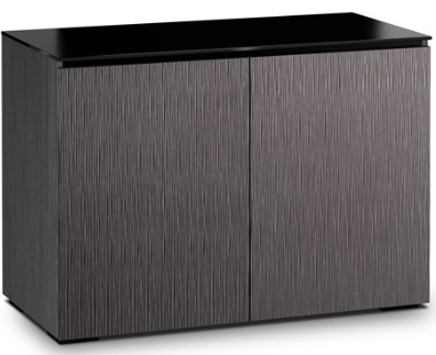 Lightly textured, alpi gray oak doors with black, tempered glass top and black oak finished end panels