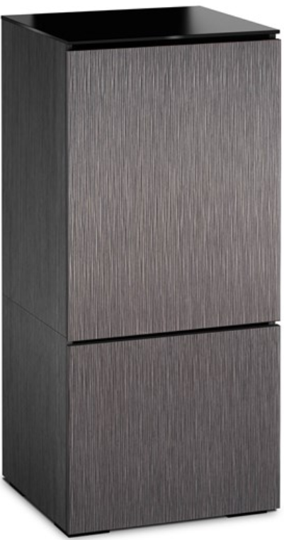 Lightly textured, alpi gray oak doors with black, tempered glass top and black oak finished end panels