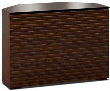 This sleek, streamlined design features a horizontal pattern on opium brown wood with a black glass top and wood block feet. Features Infinitely adjustable, black interior shelves. Built-in ventilation louvers for better air flow keep equipment cool.